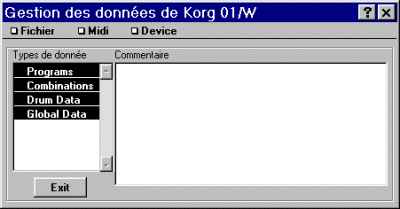 Now, whenever you access the "Modules" Menu then "Studio Modules" you?ll see that everything can be selected. You click on ?Patch? and on whatever you feel like changing (programs or combinations). Try program, for instance... a pretty Excel-like table opens up before your smoked eyes (because of the thing that?s still smoking in the ashtray beside your synth :-). Click on the top left on "data". A "data management for the Korg 01W? window opens up. Click on "file, import sysex, and get a sysex bank on the appropriate media. If you haven?t got any sysex bank, then all I?ve just tried to explain won?t be of any help.