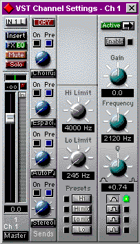 It ain't gonna be easy to clearly explain this thingie. Ok! A parametric equalizer runs on 3 knobs. One for the central frequency, one for the Q factor factor that determines the bandwidth on which the filter will act, and the last one, Gain to boost or cut those frequencies. In cubase VST it's kinda like the same but we ain't got 3 but many more buttons. So, so, so... The Hi Limit and its little brother Lo Limit will determine the frequency limits of the Frequency buttons that we'll see further. The "Lo" acts on the bottom frequency and the "Hi" is for the top frequency. Try it out and you'll get what I mean.