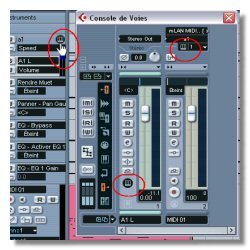 Après avoir ajouté un VST Instrument et une piste Midi qui lui sera dédiée, ouvrez la table de mixage (F3). Vous remarquerez que vous disposez là de tranches Midi ET Audio. Kessadire ? Et bien que vous pouvez gérer indépendamment les uns des autres les paramètres Midi et Audio ! |