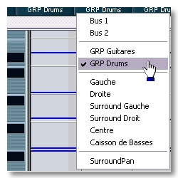 Sous le nom de la piste, vous choisirez le bus de sortie si votre carte en propose plusieurs. Si vous avez inséré des pistes Groupe, vous pourrez les sélectionner en tant que bus. Le but est d’envoyer plusieurs pistes sur une voie unique pour leur appliquer le ou les mêmes traitements. |