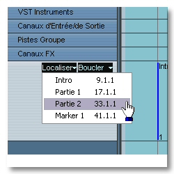 Les Marqueurs Cycle permettent de se déplacer dans le Projet. Double-cliquez dans le Cycle pour placer les délimiteurs à chaque extrémité et utilisez la touche 1 du pavé numérique pour vous caler sur celui de gauche. Le menu pop-up Localiser cale la tête de lecture au début du Cycle. |