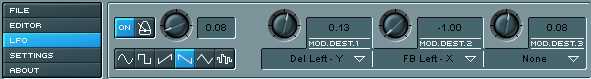 On dispose de 11 algorithmes de modulation (13 dans la version 1.5), allant d’effets de retournement à des effets de détérioration du signal, en passant par des effets rythmiques saisissants (une boucle de batterie mise dans le désordre en temps réel, ça vous dit ?). En fonction de l’algorithme choisi dans le menu déroulant, des potentiomètres apparaissent permettant de régler un tas de paramètres, tels que vitesse, feedback, fréquences affectées….je vous laisse imaginer, tous les délires sont possibles, avant même d’attaquer le delay proprement dit !