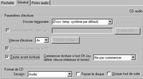 Sélectionnez la vitesse de gravure (de 1 à 4 x), testez avant d'écrire (plus prudent), choississez l'option Disque tout de suite (Disk at once), ce qui vous permettra de ne laisser aucun blanc entre chaque morceau, sinon un blanc de 2 secondes sera automatiquement créé.