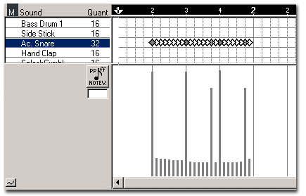 Editez avec le Drum Edit une part nouvellement créée ou déjà existante d'une piste de drum. Dans la boîte à outils, sélectionnez le pinceau et choisissez la valeur 32 dans la colonne "Quantize". Notez que cette valeur est la plus adaptée en général pour ce type de programmation, mais selon le tempo du morceau ou du son de votre caisse claire, il faudra peut-être essayer une autre valeur : 64 par exemple. Quand on maîtrise l'astuce, on peut aussi ajouter des valeurs de quantisation intermédiaires pour obtenir certains effets rythmiques, mais vous testerez cela vous-mêmes, il s'agit juste ici d'avoir une base de travail.